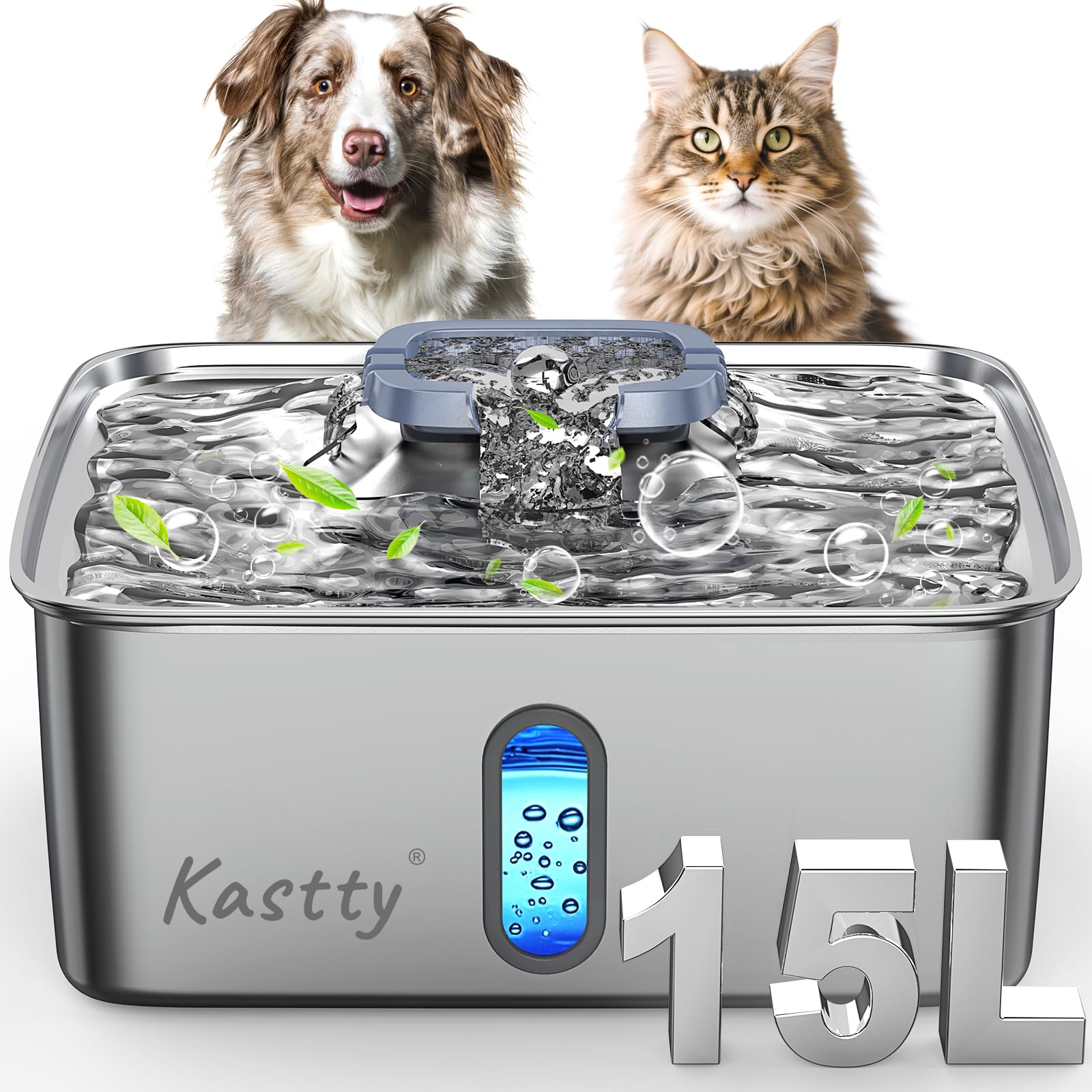 Kastty 15L/3.96 Gal Stainless Steel Dog Water Fountain, Large Capacity Dog Water Bowl Dispenser Quiet LED Light Triple Filtration BPA-Free, Automatic Pet Water Fountain Easy Cleaning Grey FS78
