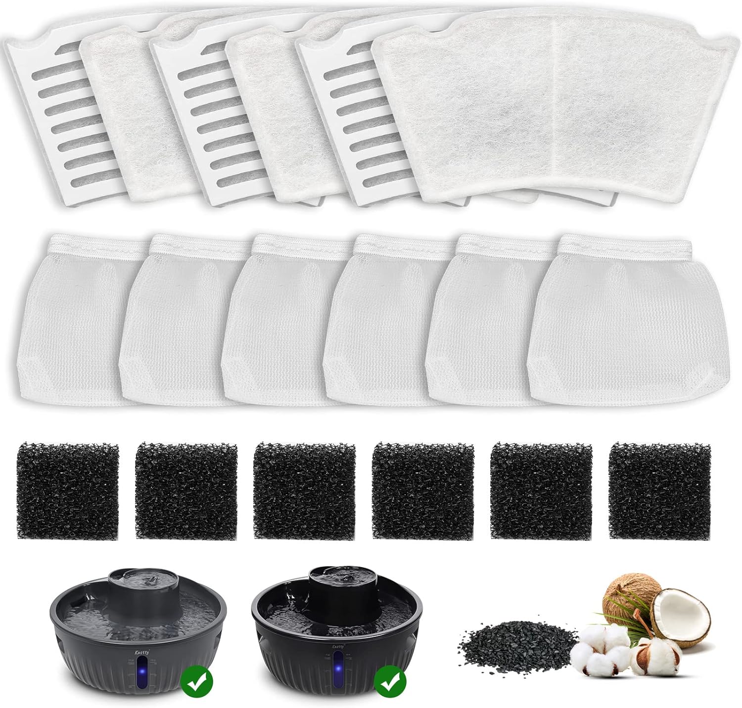 Kastty 6 Pack Replacement Filters for 195oz/6L Spiral Dog Water Fountains, Made of Coconut Shell Activated Carbon and PP Cotton, Food Grade Water Fountain Filters, with 6pcs Mesh Bag
