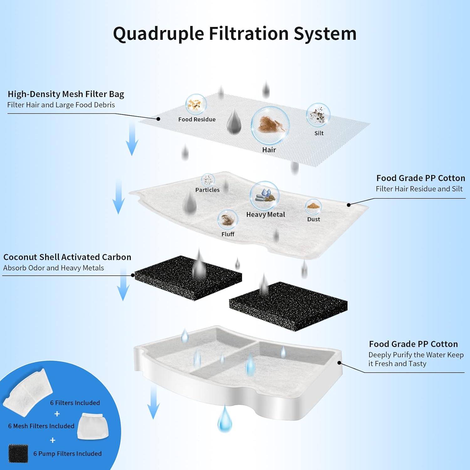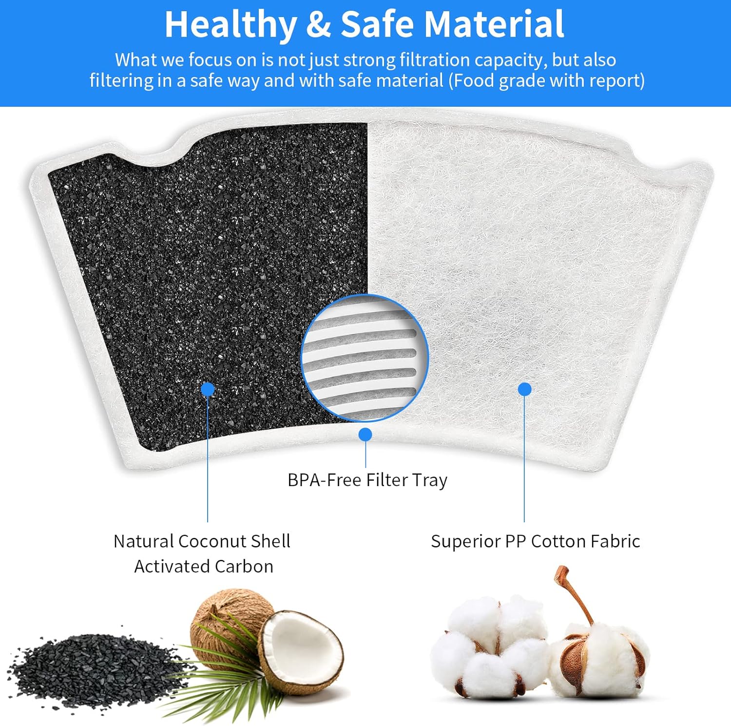 【Food Grade Water Fountain Filter】 All filters are food grade! Superior PP cotton layer we use is more durable and longer-lasting than the average. It can stay intact after tens of days' wear and tear underwater, instead of coming apart when to replace it. Natural coconut shell activated carbon tightly sealed inside won't penetrate through the pp cotton, no carbon particles evident in water.