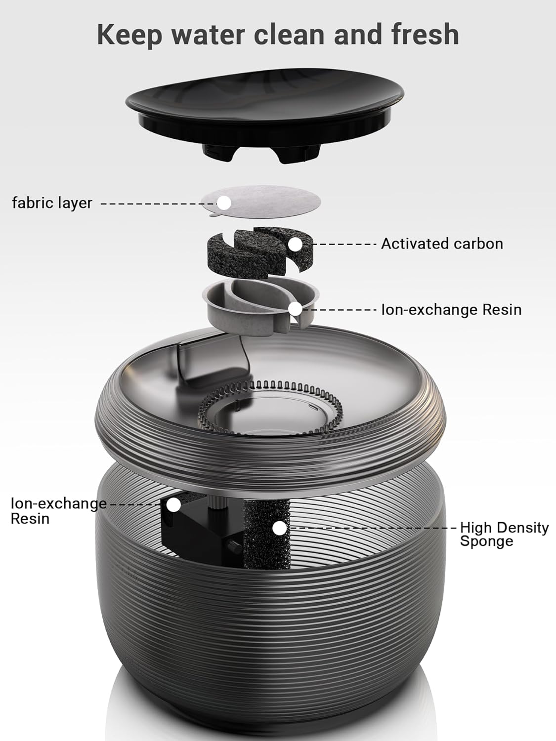 - Vertical Filtration System:1. Activated carbon eliminates foul odors 2. Ion exchange resin removes heavy metal ions and softens water quality 3. The non-woven fabric captures cats' hair and impurities 4. The built-in pump sponge further filters debris to prevent blockages and damage.