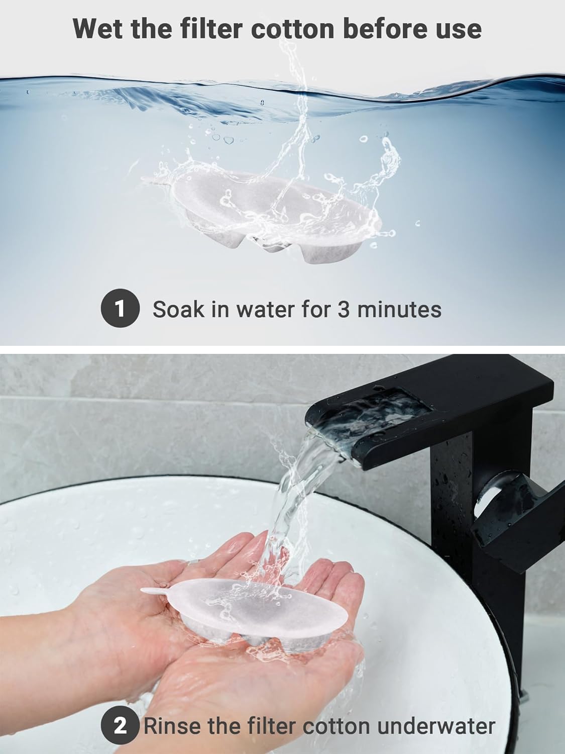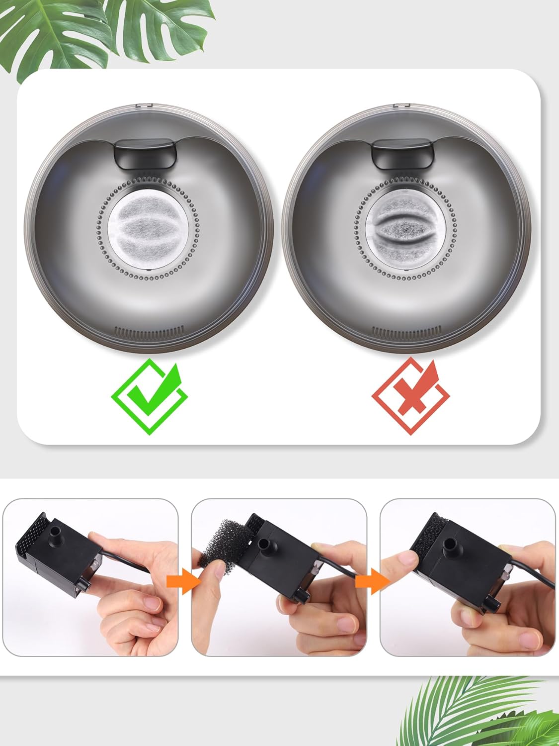 - Instructions for use: Before placing the filter cotton, wet the filter cotton under running water or soak it in water for a few minutes. Please replace the water in the water feeder after each filter replacement.