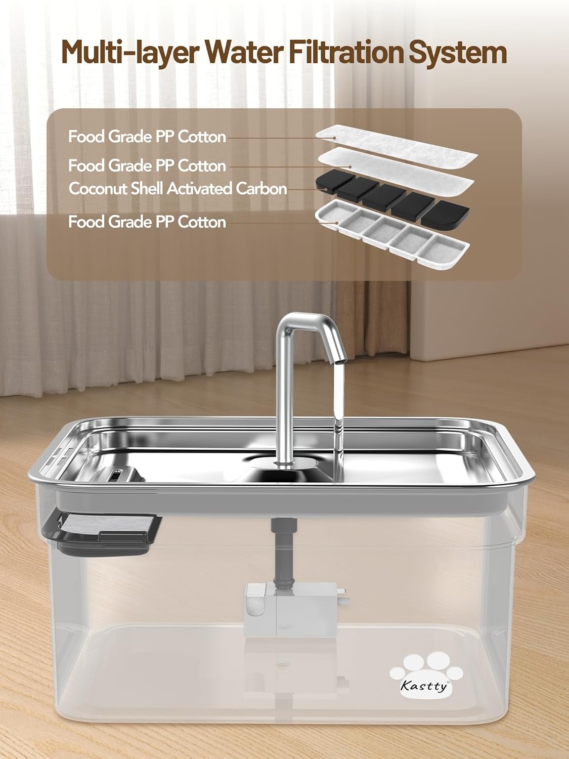 - Advanced 5-in-1 Filtration System: Our high-end coconut shell activated charcoal filter captures hair, heavy metals, and even invisible contaminants, ensuring your pet's water is clean and tastes fresh. The 5-row design of our 7-ply ultrafiltration system is not only larger but also more effective and economical